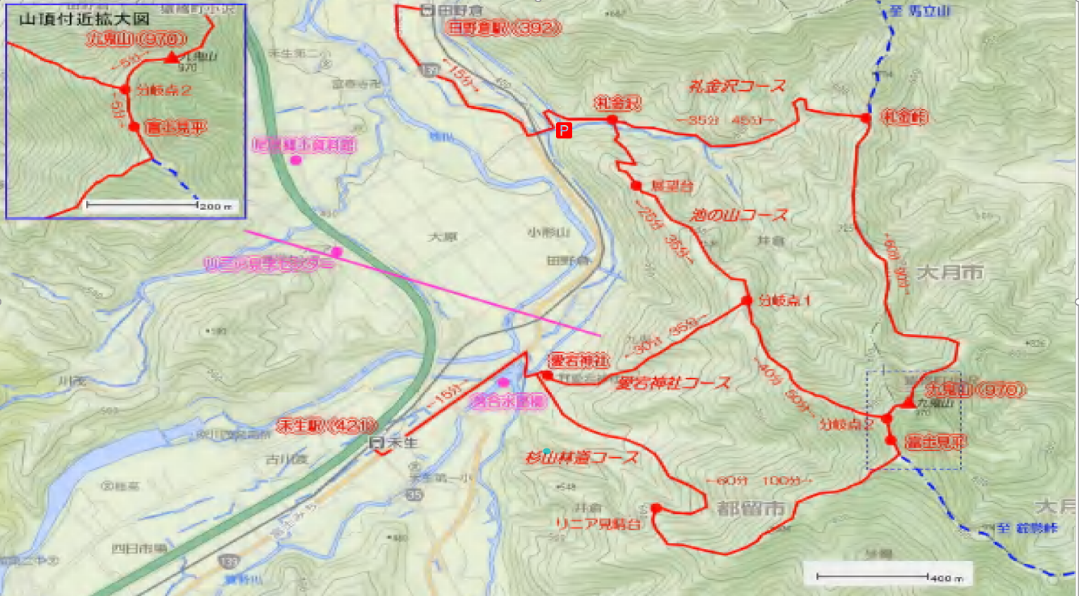 富士急行線禾生(かせい)駅から国道139号線を大月方面に向かい、レンガ造りの用水橋(落合水路橋)が見えてきたら右に入って九鬼の集落から登山道となります。登りはだんだん急になり、やがて尾根道となります。このあたりまで来ると視界は開け都留市街が一望できます。そしてその向こうには富士山がきれいに見え、その右には三つ峠から北の方向に峰々が連なります。最後の登りは若干きついですが山頂付近はとても良い眺めです。