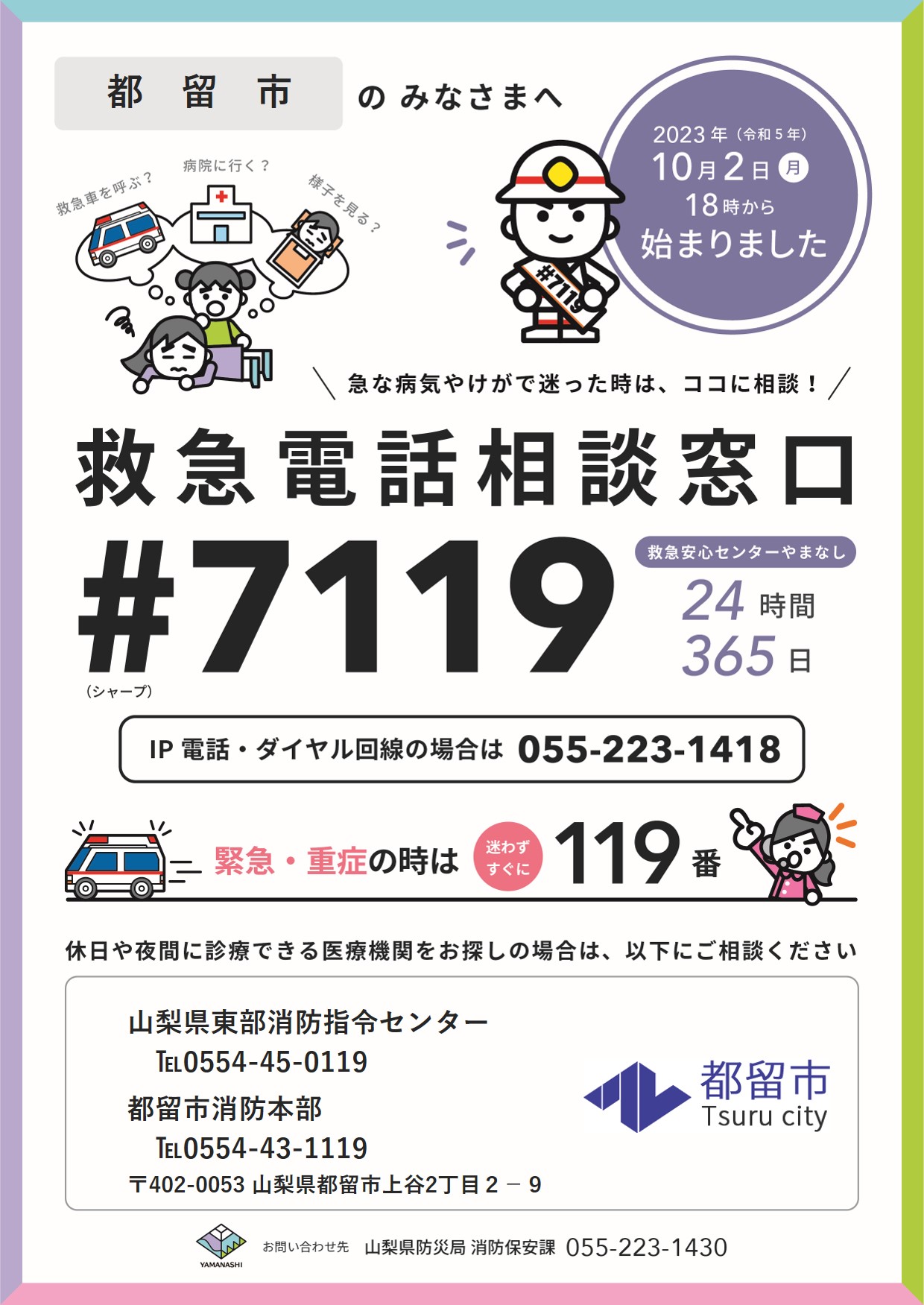 そんなとき、専門家からアドバイスを受けることができる救急電話相談窓口として、救急安心センターやまなし(#7119)があります。